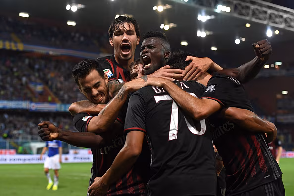 GENOA, ITALY - SEPTEMBER 16: Carlos Bacca (C) of AC Milan celebrates after scoring the opening goal with team mates during the Serie A match between UC Sampdoria and AC Milan at Stadio Luigi Ferraris on September 16, 2016 in Genoa, Italy. (Photo by Valerio Pennicino/Getty Images)