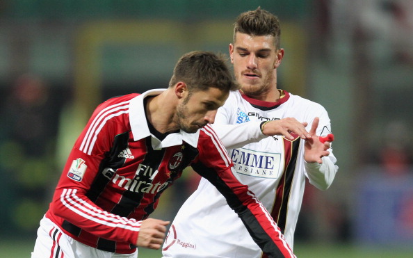 MILAN, ITALY - DECEMBER 13: Luca Antonini (L) of Milan competes with Matteo D'Alessandro of Reggina during the TIM Cup match between AC Milan and Reggina Calcio at San Siro Stadium on December 13, 2012 in Milan, Italy. (Photo by Maurizio Lagana/Getty Images)