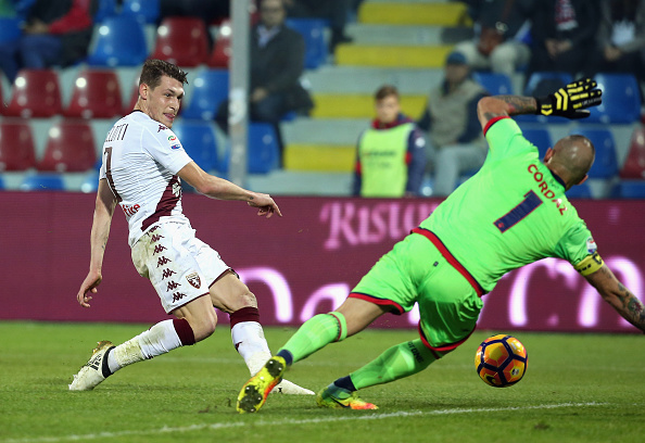 CROTONE, ITALY - NOVEMBER 20: Andrea Belotti of Torino scores his team's opening goal during the Serie A match between FC Crotone and FC Torino at Stadio Comunale Ezio Scida on November 20, 2016 in Crotone, Italy. (Photo by Maurizio Lagana/Getty Images)