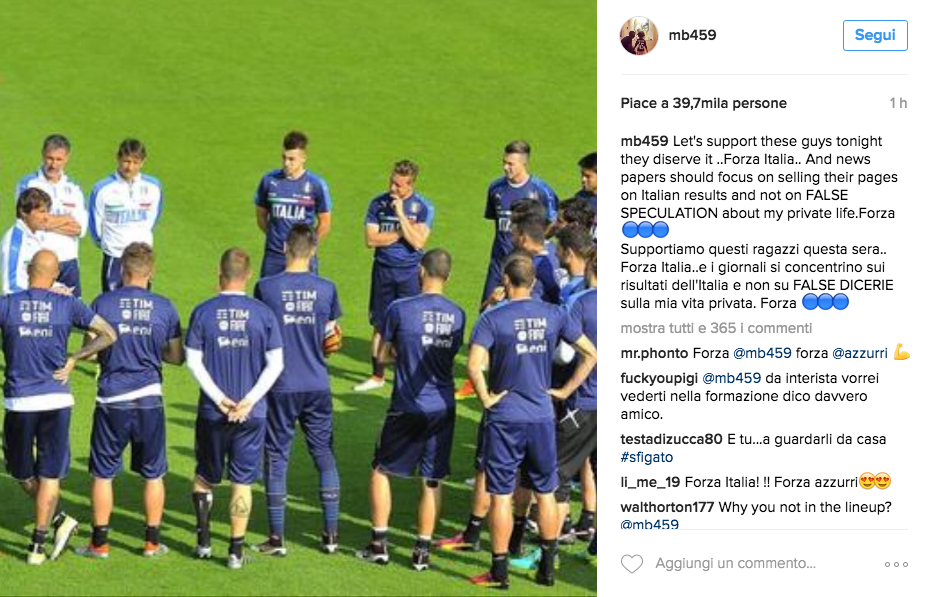 MILANO – Nelle ultime ore il suo ‘curriculum’ si è macchiato di un nuovo scandalo, insomma una nuova ‘Balotellata’. Ma le voci dell’ultima rissa in cui è rimasto coinvolto non sembrano averlo scalfito. Super Mario, non convocato con la nazionale azzurra di Conte, ha voluto supportare i suoi compagni con un messaggio al miele, postanto qualche minuto fa sul proprio profilo Instagram: