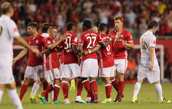 CHICAGO, IL - JULY 27: David Alaba (number 27) of Bayern Muenchen celebrates his first goal together with teammates during the International Champions Cup between FC Bayern Muenchen and AC Milan of AUDI Summer Tour USA 2016 at Soldier Field on July 27, 2016 in Chicago, Illinois. (Photo by Alexandra Beier/Bongarts/Getty Images)