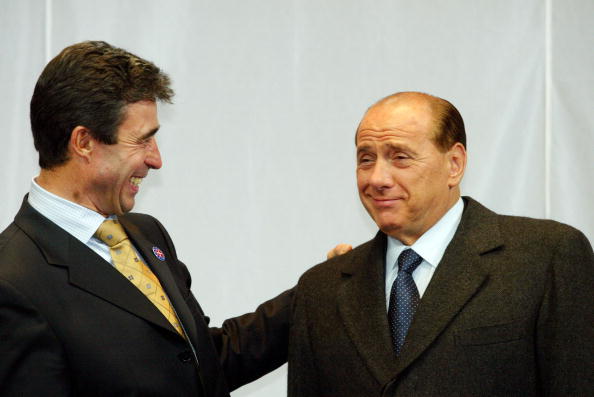 BRUSSELS, BELGIUM - OCTOBER 24: Danish Prime Minister Anders Forg Rasmussen greets Italian Prime Minister Silvio Berlusconi at the start of the European Union (EU) Heads of Government summit October 24, 2002 in Brussels, Belgium. During the second summit day, the EU politicians will consider the expansion of the EU to include 10 new member states, the EU?s constitution and reforms of the common agricultural and fishery policies. (Photo by Francois Lenoir-Pool/Getty Images)