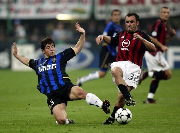 MILAN - MAY 7: Cristian Brocchi of AC Milan is tackled by Emre Belozoglu of Inter Milan during the UEFA Champions League Semi-Final First Leg match between AC Milan and Internazionale Milano held on May 7, 2003 at the Guiseppe Meazza San Siro, in Milan, Italy. The match ended in a 0-0 draw. (Photo by Clive Brunskill/Getty Images)