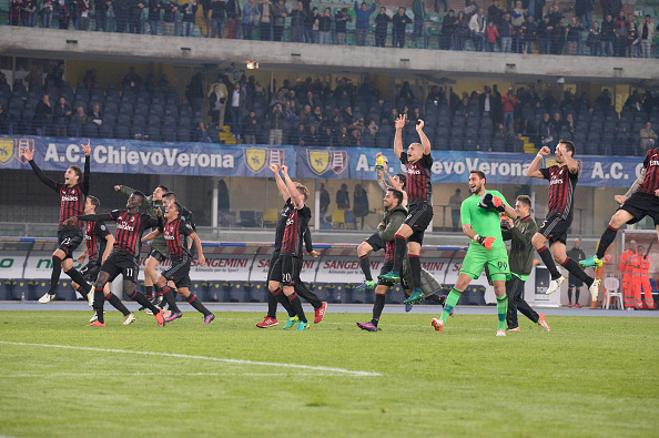 VERONA, ITALY - OCTOBER 16: AC Milan players celebrate victory after the Serie A match between AC ChievoVerona and AC Milan at Stadio Marc'Antonio Bentegodi on October 16, 2016 in Verona, Italy. (Photo by Dino Panato/Getty Images)