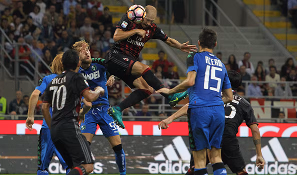 MILAN, ITALY - OCTOBER 02: Gabriel Paletta (C) of AC Milan scores his goal during the Serie A match between AC Milan and US Sassuolo at Stadio Giuseppe Meazza on October 2, 2016 in Milan, Italy. (Photo by Marco Luzzani/Getty Images)