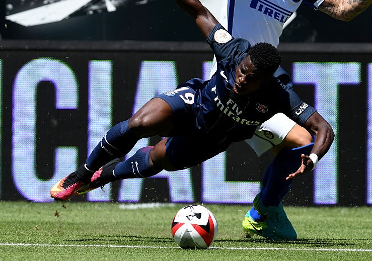 EUGENE, OR - JULY 24: Stevan Jovetic of FC Internazionale (R) and Serge Aurier of PSG compete for the ball during the International Champions Cup 2016 match between FC Internazionale and Paris Saint-Germain at Autzen Stadium on July 24, 2016 in Eugene, Oregon. (Photo by Claudio Villa - Inter/Inter via Getty Images)