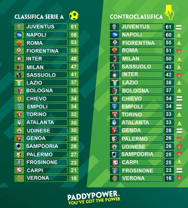 MILANO – Attualmente i rossoneri hanno 47 punti e sono in sesta posizione con solo una lunghezza di distanza dall’Inter. La casa di scommesse Paddy Power ha pubblicato la classifica senza errori arbitrali e il Milan guadagna non solo una posizione ( 5°) ma anche un minor divario di punti (50). Infatti il quarto posto è occupato dalla Roma a quota 51 e il terzo dalla Fiorentina a 55. Rossoneri che sono dunque in credito di fortuna al contrario dei cugini nerazzurri che sarebbero settimi dietro il Sassuolo