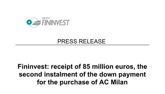 Il comunicato di Fininvest: ” Fininvest è lieta di confermare il pagamento effettuato dalla Sino Europe Sports Investment Management Changxing Co.Ltd. della seconda rata della caparra stabilita nel contratto preliminare per la cessione del AC Milan firmato il 5 agosto anno corrente. Come concordato dai termini prestabiliti, il pagamento dei 15 milioni fu immediato al momento della prima firma, e oggi gli investitori Cinesi pagano a Fininvest i restanti 85 milioni. Questo è un importante passo avanti per la chiusura della transazione entro la fine di quest’anno”. Intanto il Milan sogna già il colpo di gennaio…