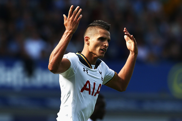 LIVERPOOL, ENGLAND - AUGUST 13: Erik Lamela of Tottenham Hotspur celebrates scoring his sides first goal during the Premier League match between Everton and Tottenham Hotspur at Goodison Park on August 13, 2016 in Liverpool, England. (Photo by Jan Kruger/Getty Images)