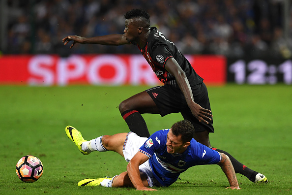 GENOA, ITALY - SEPTEMBER 16: Pedro Miguel Pereira (R) of UC Sampdoria is tackled by Mbaye Niang of AC Milan during the Serie A match between UC Sampdoria and AC Milan at Stadio Luigi Ferraris on September 16, 2016 in Genoa, Italy. (Photo by Valerio Pennicino/Getty Images)