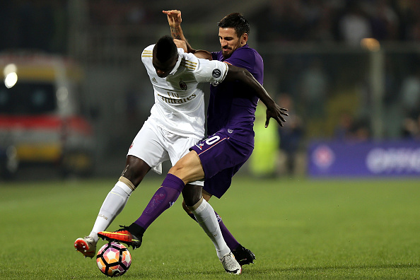 FLORENCE, ITALY - SEPTEMBER 25: Nenad Topmovic of ACF Fiorentina fights for the ball with M'Baye Niang of AC Milan during the Serie A match between ACF Fiorentina and AC Milan at Stadio Artemio Franchi on September 25, 2016 in Florence, Italy. (Photo by Gabriele Maltinti/Getty Images)