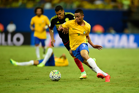 MANAUS, BRAZIL - SEPTEMBER 06: Gabriel Jesus player of Brazil competes for the ball with Jeison Murillo player of Colombia during 2018 FIFA World Cup Russia qualification match between Brazil and Colombia at Arena da Amazonia at Arena da Amazonia on September 6, 2016 in Manaus, Brazil. (Photo by Bruno Zanardo/Getty Images)