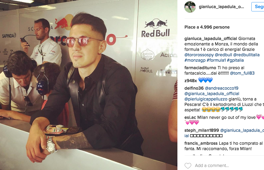 MILANO – Non solo Claudio Marchisio ma c’era anche Gianluca Lapadula, attaccante rossonero, al Gran Premio di Monza. L’attaccante rossonero è stato ospite del box della Toro Rosso. Giornata entusiasmante per lui, come testimoniano le foto con annesse didascalie postate su Instagram:“Giornata emozionante a Monza, il mondo della Formula 1 è carico di energia! Grazie”. Il Milanista.it