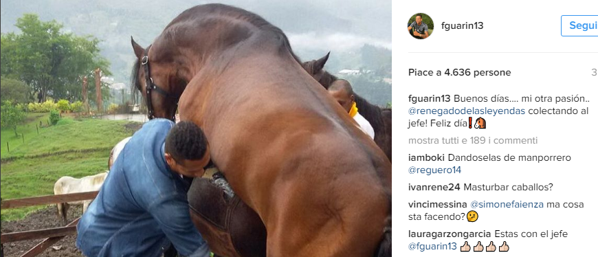 MILANO – Fredy Guarin, ex calciatore dell’Inter e ora allo Shanghai, ha rivelato oggi la sua seconda passione dopo il calcio: i cavalli. L’ex nerazzurro, in passato decisivo nel derby, ha pubblicato oggi una foto su Instagram in cui è intento ad aiutare un cavallo a espletare i propri bisogni fisici. Il colombiano evidentemente ha un modo tutto suo per non pensare al derby e alla tensione che la stracittadina porta con sé. Ovviamente non mancano i commenti dei follower parecchio sconcertati. Intanto Montella svela la formazione….
