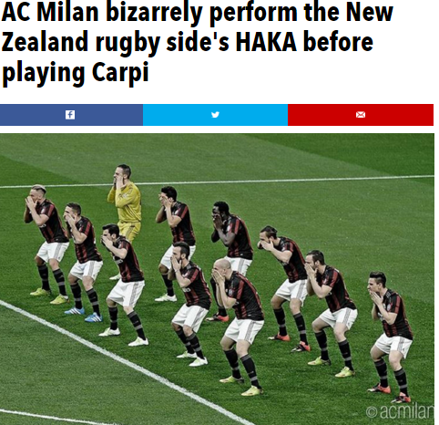 MILANO – La Nuova Zelanda non sembra aver gradito la scelta del Milan di far recitare l’Haka, il ballo tipico dei Neozelandesi, reso famoso dagli All Blacks, ad alcune controfigure vestite da giocatori del Milan, prima della gara contro il Carpi. Sui social sono apparsi tantissimi commenti, e anche il giornale New Zealand Herald ha criticato la scelta dei rossoneri. “Uno degli spot più orribili e disgustosi nella storia dello sport. L’AC Milan, uno dei più grandi club calcistici d’Europa, ha appena commesso il proprio suicidio sui social, e internet sta esplodendo. Avremmo voluto che una cosa del genere non fosse vera. Questa è una di quelle volte in cui ti metti la testa fra le mani e ti chiedi ‘a che punto sta arrivando il mondo?”.