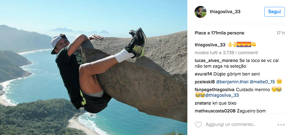 RIO DE JANEIRO– Vacanze brasiliane per il forte difensore del Paris Saint Germain Thiago Silva. Forse solo un pò troppo spericolate se si osservano le ultime due istantanee che l’ex Milan ha postato sul suo profilo ufficiale Instagram. “Che vista eh … è stato difficile da scalare, ma vale la pena “, ha scritto Thiago nella leggenda di una delle immagini. Presente in questa audace e temeraria scalata anche Thiago Marcào, assistente della Fluminense e amico del giocatore.