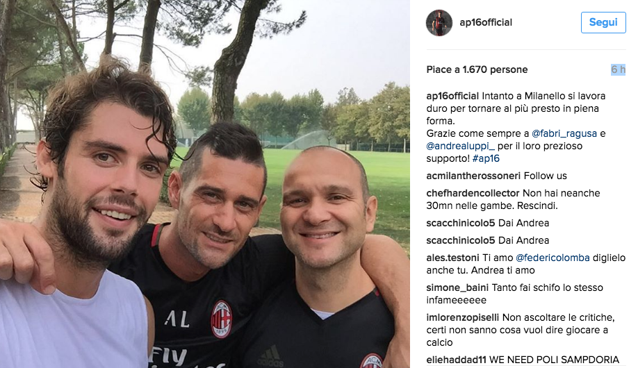 MILANO – Chi non è partito per la trasferta inglese contro il Bournemouth è Andrea Poli. Il centrocampista rossonero è infatti rimasto ad allenarsi a Milanello per cercare di recuperare dopo l’infortunio accorso nella sfortunata trasferta di Napoli. E’ proprio il giocatore a condividere il suo stato d’animo su Instagram ringraziando lo staff sanitario: