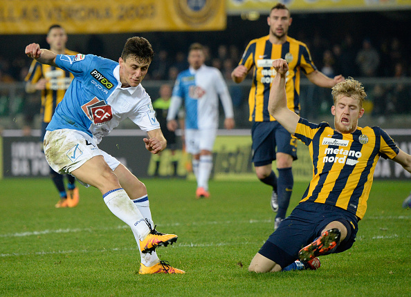 VERONA, ITALY - FEBRUARY 20: Filip Helander (R) of Hellas Verona competes with Roberto Inglese of Chievo Verona during the Serie A match between Hellas Verona FC and AC Chievo Verona at Stadio Marc'Antonio Bentegodi on February 20, 2016 in Verona, Italy. (Photo by Dino Panato/Getty Images)