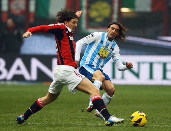 MILAN, ITALY - DECEMBER 16: Riccardo Montolivo (L) of AC Milan competes for the ball with Francesco Modesto of Pescara during the Serie A match between AC Milan and Pescara at San Siro Stadium on December 16, 2012 in Milan, Italy. (Photo by Paolo Bruno/Getty Images)
