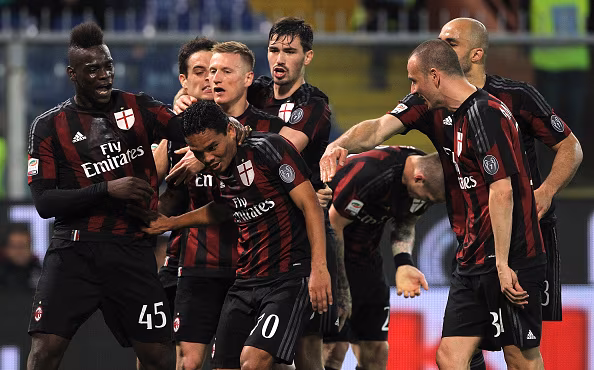 GENOA, ITALY - APRIL 17: Carlos Bacca (C) of AC Milan celebrates with his team-mates after scoring the opening goal during the Serie A match between UC Sampdoria and AC Milan at Stadio Luigi Ferraris on April 17, 2016 in Genoa, Italy. (Photo by Marco Luzzani/Getty Images)