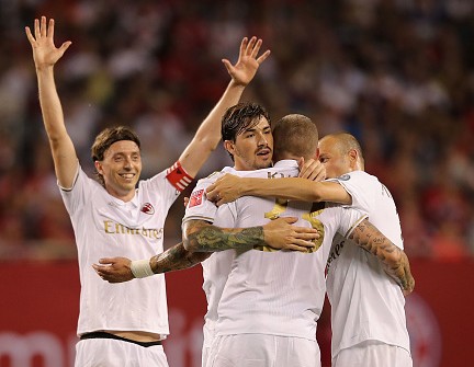 CHICAGO, IL - JULY 27: Andrea Bertollaci (2ndR) of Milan celebrates his goal together with teammates Riccardo Montolivo, Alessio Romagnoli and Luca Antonelli (L-R) during the International Champions Cup between FC Bayern Muenchen and AC Milan of AUDI Summer Tour USA 2016 at Soldier Field on July 27, 2016 in Chicago, Illinois. (Photo by Alexandra Beier/Bongarts/Getty Images)