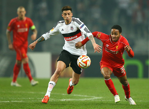 ISTANBUL, TURKEY - FEBRUARY 26: Jose Ernesto Sosa of Besiktas battles with Raheem Sterling of Liverpool during the 2nd leg of the UEFA Europa League Round of 32 match between Besiktas and Liverpool at the Ataturk Olympic Stadium on February 26, 2015 in Istanbul, Turkey. (Photo by Richard Heathcote/Getty Images)