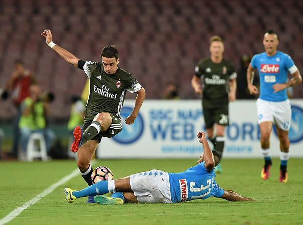 NAPLES, ITALY - AUGUST 27: Napoli's player Faouzi Ghoulam vies with AC Milan player Giacomo Bonaventura during the Serie A match between SSC Napoli and AC Milan at Stadio San Paolo on August 27, 2016 in Naples, Italy. (Photo by Francesco Pecoraro/Getty Images)