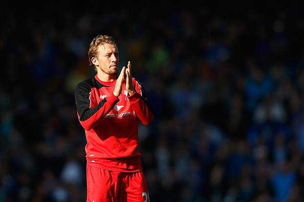 LIVERPOOL, ENGLAND - OCTOBER 04: Lucas Leiva of Liverpool claps the away support after the Barclays Premier League match between Everton and Liverpool at Goodison Park on October 4, 2015 in Liverpool, England. (Photo by Dean Mouhtaropoulos/Getty Images)