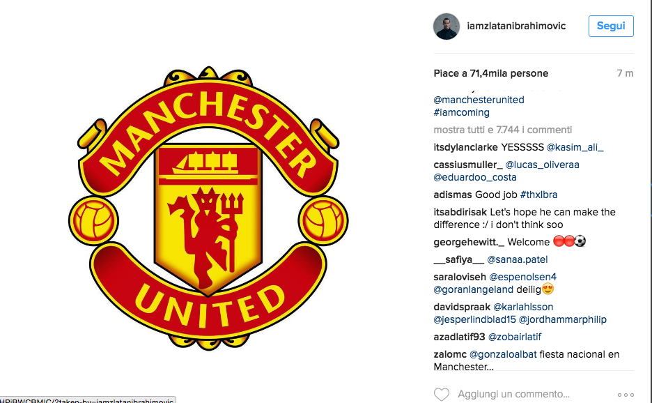 MILANO – Dopo settimane di smentite e depistaggi, è ormai tutto pronto per il trasferimento di Zlatan Ibrahimovic al Manchester United. Domani, infatti, con ogni probabilità sarà il giorno in cui i Red Devils annunceranno l’ingaggio dell’attaccante. Qualche minuto fa invece è arrivato l’annuncio del diretto interessato che, attraverso il suo profilo ufficiale Instagram, ha rotto ogni indugio: “Time to let the world know. My next destination is @manchesterunited“. Ma intanto il Milan tenta il colpaccio…