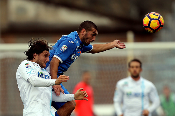 EMPOLI, ITALY - OCTOBER 23: Guido Marilungo of Empoli FC battles for the ball with Perparim Hetamaj of AC Chievo Verona during the Serie A match between Empoli FC and AC ChievoVerona at Stadio Carlo Castellani on October 23, 2016 in Empoli, Italy. (Photo by Gabriele Maltinti/Getty Images)