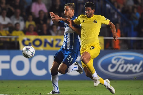 VILLARREAL, SPAIN - AUGUST 23: Mateo Musacchio of Villarreal CF competes with Rúrik Gíslason of Odense BK during the UEFA Champions League playoff match between Villarreal CF and Odense BK at El Madrigal on August 23, 2011 in Villarreal, Spain. (Photo by Valerio Pennicino/Getty Images)