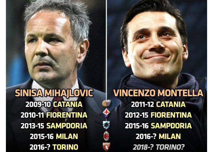 MILANO – Sinisa Mihajlovic e Vincenzo Montella, sulla carta due allenatori completamente diversi sia come gioco che a livello personale, ma che alla fine hanno fatto la stessa strada. I due hanno giocato anche assieme ai tempi della Sampdoria e da quel momento i loro destini si sono incrociati a ripetizione. Montella infatti ha sempre sostituito il serbo in panchina. Comincia tutto ai tempi del Catania che Mihajlovic lasciò nel 2010, passa appena una stagione e anche l’Aeroplanino diventa tecnico degli etnei. Sinisa passa poi alla Fiorentina a stagione in corso, mentre l’anno successivo viene esonerato a poche giornate dalla fine. Montella in Toscana rende decisamente di più e trasforma i Viola in una squadra formato Europa grazie alla serie di qualificazioni consecutive all’Europa League. Mihajlovic nel frattempo passa prima alla Sampdoria e poi al Milan contendendosi la panchina proprio con l’ex attaccante. In blucerchiato, dopo la breve parentesi Zenga, arriva anche Montella che però non riesce a dare il meglio a stagione in corso. Ora con l’ufficialità Vincenzo ha completato il suo inseguimento all’attuale tecnico del Torino e sui social c’è già chi pronostica l’Aeroplanino sulla panchina granata. Intanto i rossoneri vogliono fare il primo regalo al nuovo allenatore..CLICCA QUI