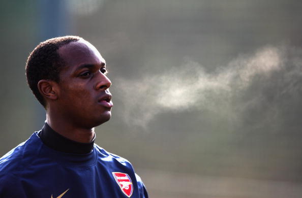 LONDON - FEBRUARY 19: Justin Hoyte in action during an Arsenal training session at London Colney Training Ground on February 19, 2008 in London, England. (Photo by Clive Mason/Getty Images)