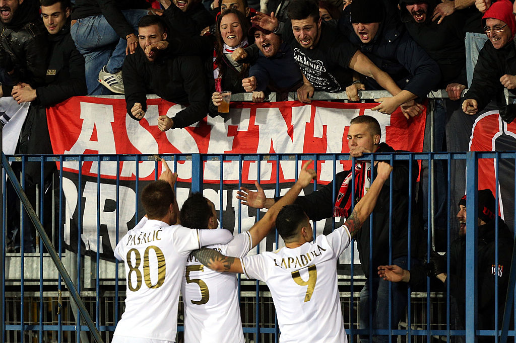 EMPOLI, ITALY - NOVEMBER 26: Players of AC Milan exult after the own goal by Andrea Costa Empoli FC during the Serie A match between Empoli FC and AC Milan at Stadio Carlo Castellani on November 26, 2016 in Empoli, Italy. (Photo by Gabriele Maltinti/Getty Images)