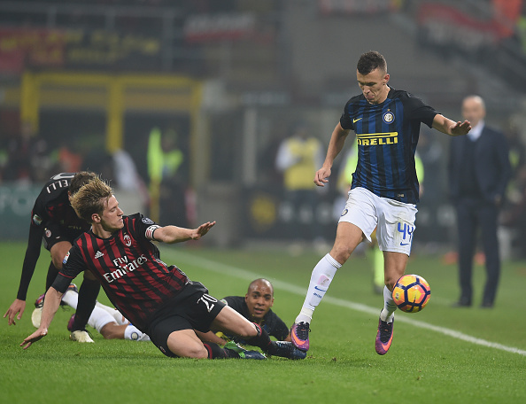 MILAN, ITALY - NOVEMBER 20: Ivan Perisic of FC Internazionale (R) competes for the ball with Ignazio Abate of AC Milan during the Serie A match between AC Milan and FC Internazionale at Stadio Giuseppe Meazza on November 20, 2016 in Milan, Italy. (Photo by Claudio Villa - Inter/Inter via Getty Images)