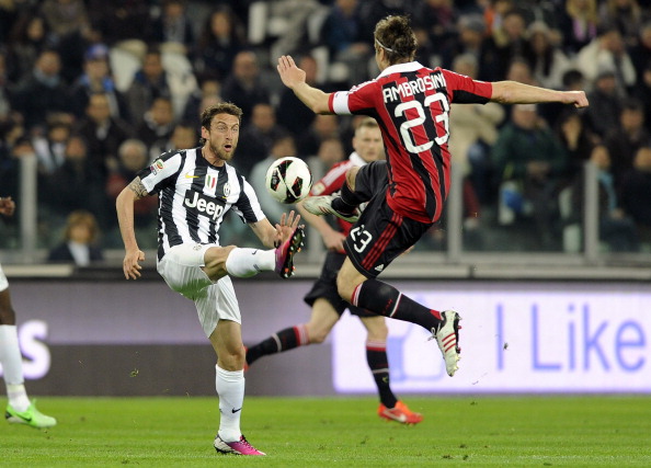 TURIN, ITALY - APRIL 21: Claudio Marchisio of Juventus (L) and Massimo Ambrosini of AC Milan compete for a high ball during the Serie A match Juventus FC v AC Milan at Juventus Arena on April 21, 2013 in Turin, Italy. (Photo by Claudio Villa/Getty Images)