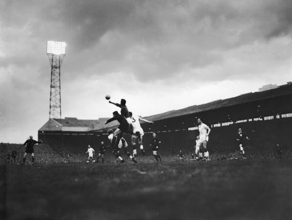 Manchester United keeper Harry Gregg punches a ball clear after an attack on goal during a match against AC Milan in the first leg of the European Cup semi-finals at Old Trafford, 9th May 1958. United won the match 2-1. (Photo by Keystone/Hulton Archive/Getty Images)