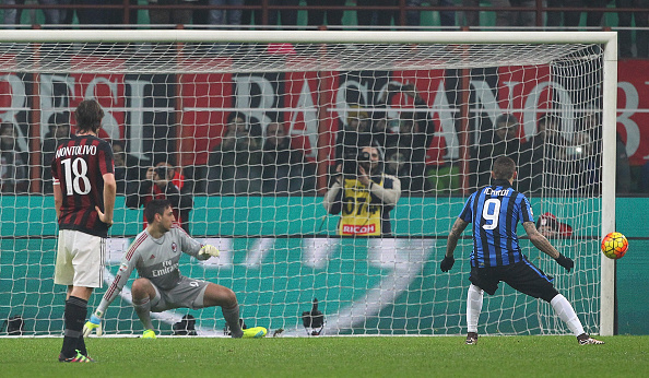 MILAN, ITALY - JANUARY 31: Mauro Emanuel Icardi (R) of FC Internazionale Milano strikes the post from the penalty spot during the Serie A match between AC Milan and FC Internazionale Milano at Stadio Giuseppe Meazza on January 31, 2016 in Milan, Italy. (Photo by Marco Luzzani/Getty Images)