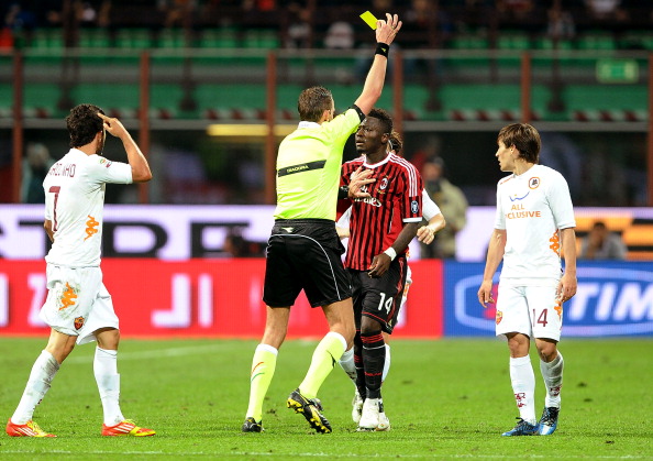 MILAN, ITALY - MARCH 24: The refree Paolo Silvio Mazzoleni gives a yellow card to Sulley Muntari of AC Milan during the Serie A match between AC Milan and AS Roma at Stadio Giuseppe Meazza on March 24, 2012 in Milan, Italy. (Photo by Luciano Rossi/AS Roma via Getty Images)