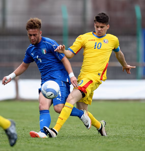 GUALDO TADINO, ITALY - MAY 11: Alessandro Bordin (L) of Italy competes for the ball with Ianis Hagi of Romania during the U18 international friendly match between Italy and Romania on May 11, 2016 in Gualdo Tadino, Italy. (Photo by Paolo Bruno/Getty Images)