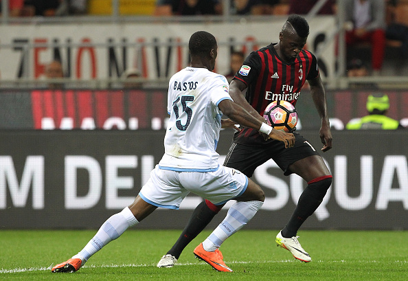 MILAN, ITALY - SEPTEMBER 20: MÕ Baye Niang (R) of AC Milan competes for the ball with Bastos (L) of SS Lazio during the Serie A match between AC Milan and SS Lazio at Stadio Giuseppe Meazza on September 20, 2016 in Milan, Italy. (Photo by Marco Luzzani/Getty Images)