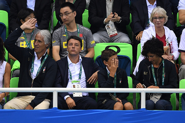 RIO DE JANEIRO, BRAZIL - AUGUST 06: Prime Minister of Italy Mateo Renzi (2nd L) and wife Agnese (R) attend men's 400m freestyle final on Day 1 of the Rio 2016 Olympic Games at the Olympic Aquatics Stadium on August 6, 2016 in Rio de Janeiro, Brazil. (Photo by Pascal Le Segretain/Getty Images)