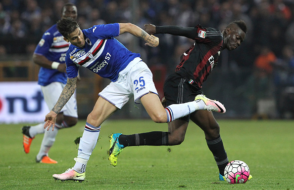 GENOA, ITALY - APRIL 17: Mario Balotelli (R) of AC Milan is challenged by Ricardo Alvarez (L) of UC Sampdoria during the Serie A match between UC Sampdoria and AC Milan at Stadio Luigi Ferraris on April 17, 2016 in Genoa, Italy. (Photo by Marco Luzzani/Getty Images)