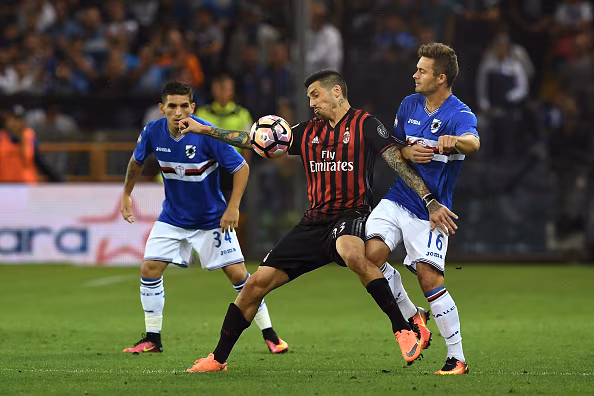 GENOA, ITALY - SEPTEMBER 16: Karol Linetty (R) of UC Sampdoria competes with Jose Sosa of AC Milan during the Serie A match between UC Sampdoria and AC Milan at Stadio Luigi Ferraris on September 16, 2016 in Genoa, Italy. (Photo by Valerio Pennicino/Getty Images)