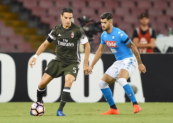 NAPLES, ITALY - AUGUST 27: Napoli's player Elseid Hysaj vies with AC Milan player Giacomo Bonaventura during the Serie A match between SSC Napoli and AC Milan at Stadio San Paolo on August 27, 2016 in Naples, Italy. (Photo by Francesco Pecoraro/Getty Images)