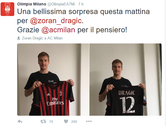 MILANO – Quest’oggi il Milan, ha voluto fare una bella sorpresa a Zoran Dragic, guardia slovena dell’Olimpia EA7 Milano, da sempre tifoso rossonero insieme al fratello Goran, che attualmente gioca in NBA con i Miami Heat. I rossoneri gli hanno infatti fatto recapitare una maglia ufficiale da gioco personalizzata con impresso il suo nome. Ecco le immagini.