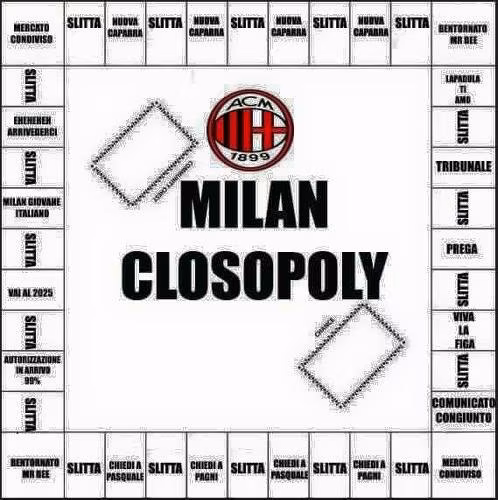 MILANO – Fininvest e Sino Europe sport hanno emesso il nuovo comunicato ufficiale. Il closing è stato rinviato e questa volta si parla del 3 marzo. Sui social ovviamente si è scatenata l’ironia di quelli che nel closing e nei cinesi non ci credono. Tra i tanti sfottò è nato il “Closopoli”, gioco da tavolo che imita il più celebre Monopoli. Tra le caselle più divertenti troviamo “Ben tornato Mr. Bee”, “Milan giovane e italiano” e numerosi “Slitta”. Le prese in giro però sono moltissime, eccone alcune. Intanto Berlusconi è stato ricoverato in ospedale…
