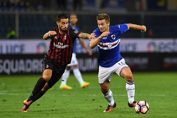 GENOA, ITALY - SEPTEMBER 16: Karol Linetty (R) of UC Sampdoria is challenged by Fernandez Suso of AC Milan during the Serie A match between UC Sampdoria and AC Milan at Stadio Luigi Ferraris on September 16, 2016 in Genoa, Italy. (Photo by Valerio Pennicino/Getty Images)