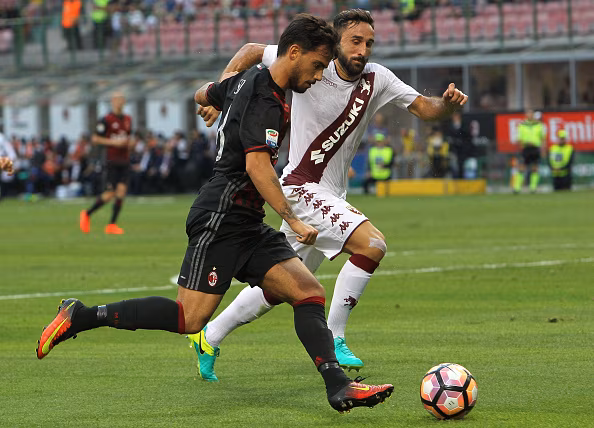 MILAN, ITALY - AUGUST 21: Suso of Milan competes for the ball with Cristian Molinaro of Torino FC during the Serie A match between AC Milan and FC Torino at Stadio Giuseppe Meazza on August 21, 2016 in Milan, Italy. (Photo by Marco Luzzani/Getty Images)