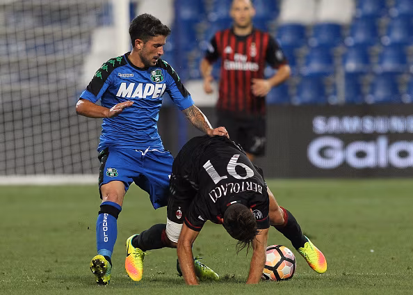 REGGIO NELL'EMILIA, ITALY - AUGUST 10: Andrea Bertolacci (R) of AC Milan competes for the ball with Stefano Sensi (L) of US Sassuolo during the TIM Preseason Tournament at Mapei Stadium - Citta' del Tricolore on August 10, 2016 in Reggio nell'Emilia, Italy (Photo by Marco Luzzani/Getty Images)